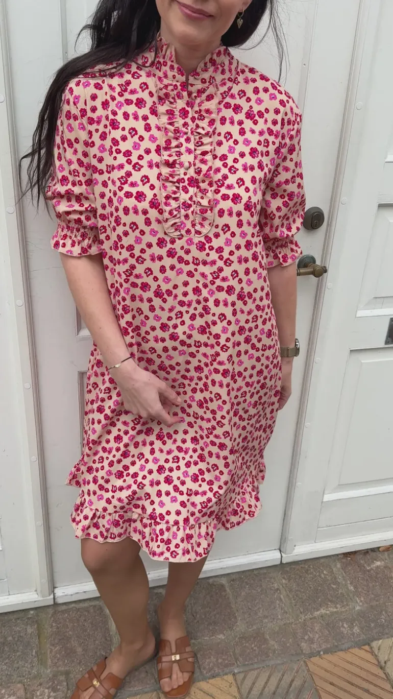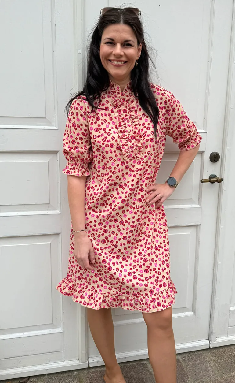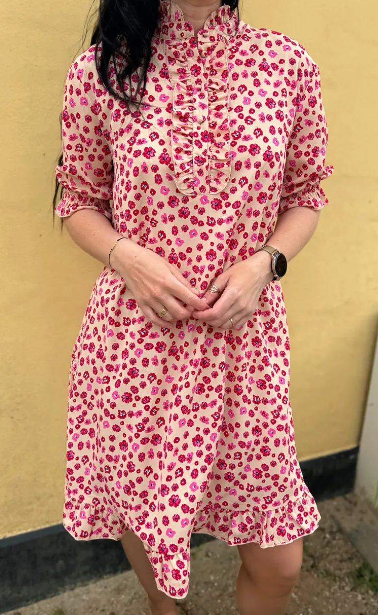 Flot kjole kjole fra INA Copenhagen med blomster i pinke og røde nuancer.