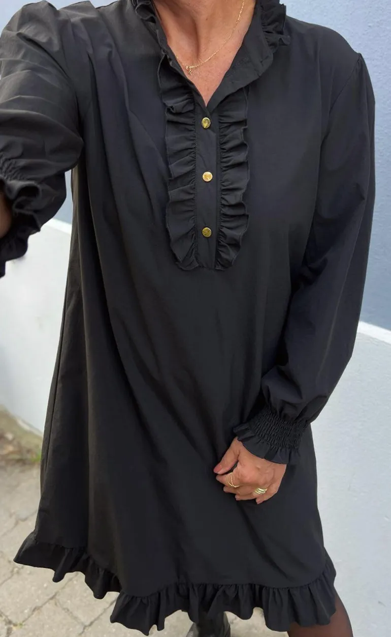 Smuk kjole fra INA Copenhagen i sort med guld knapper.