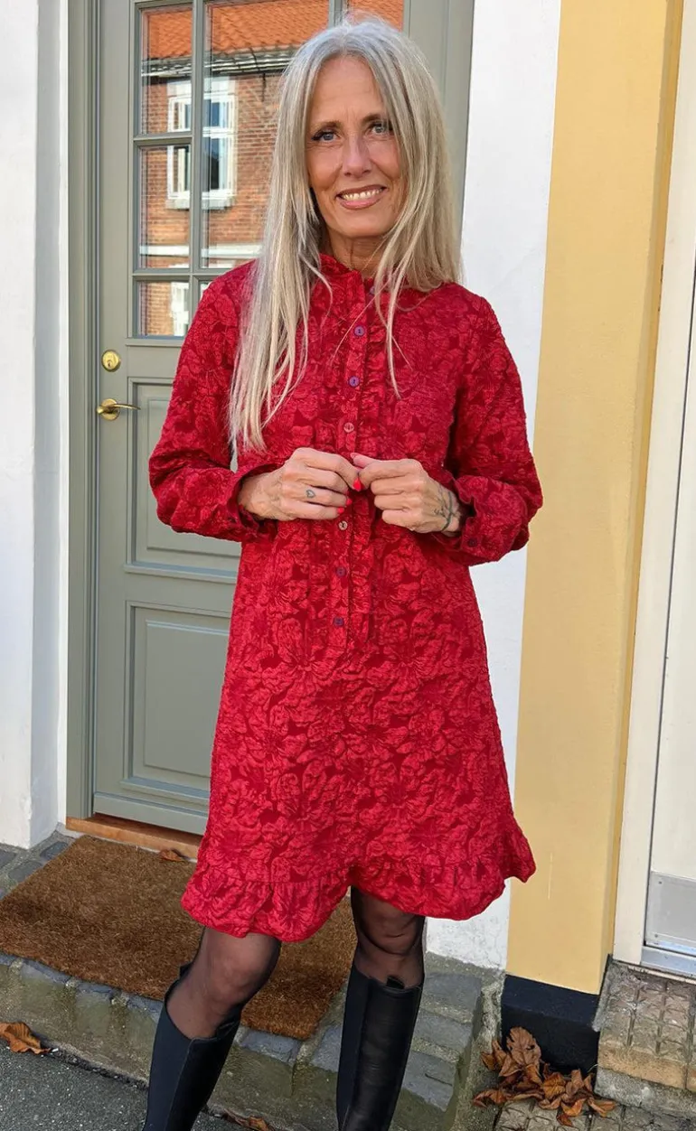 Eksklusiv kjole fra INA Copenhagen i rød med et 3D-blomsterprint med stræk i materialet.