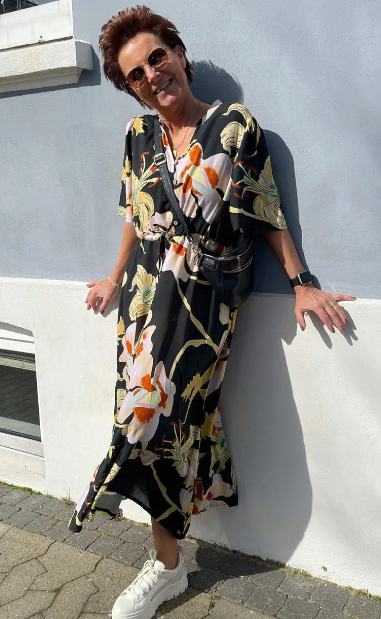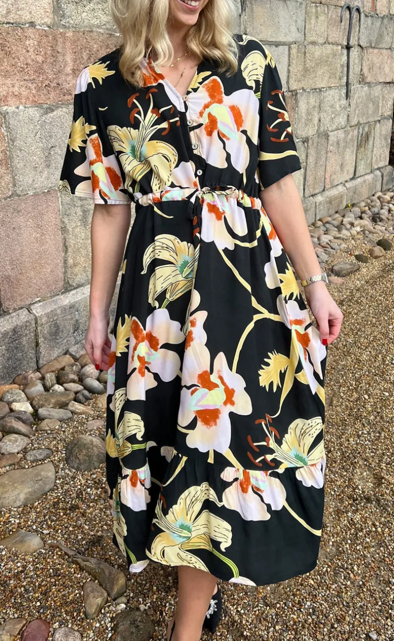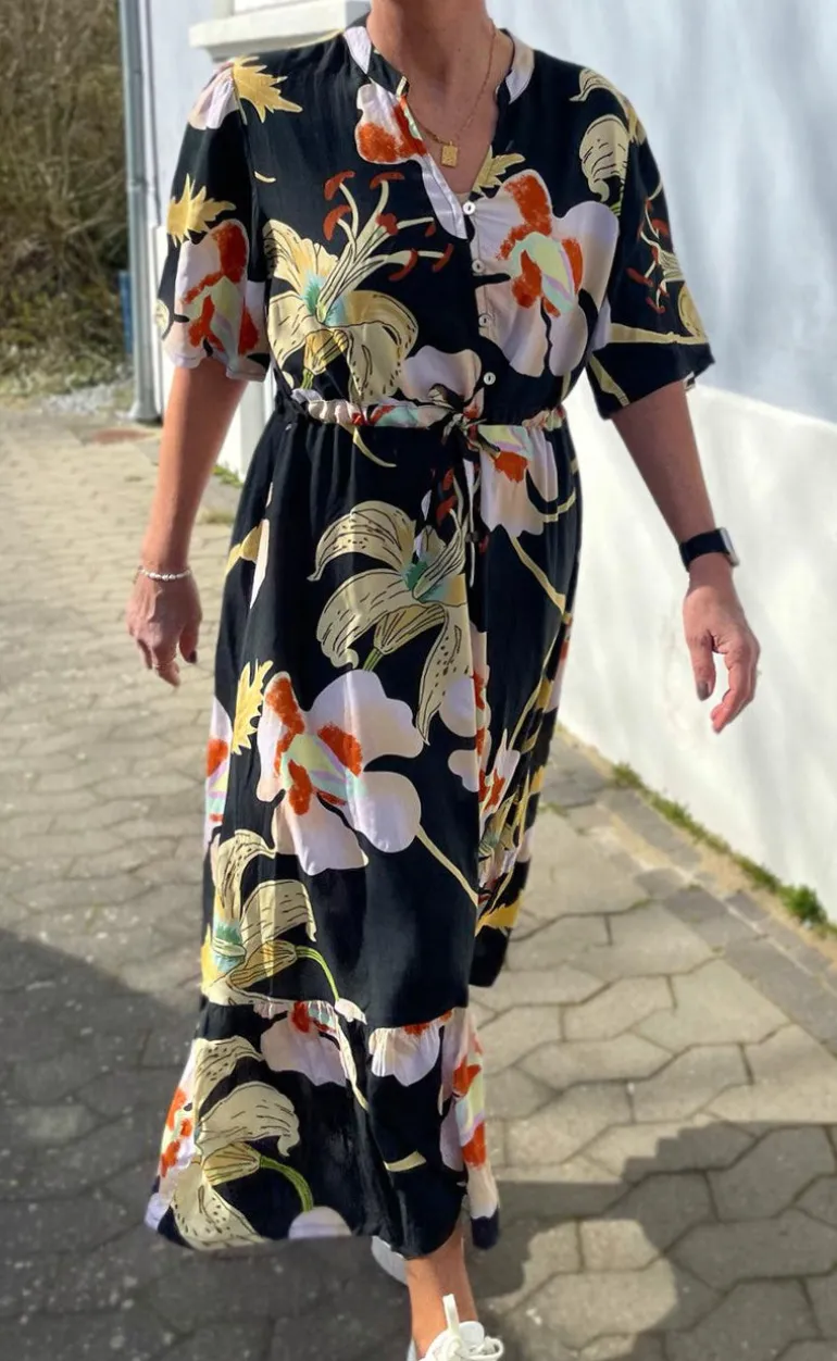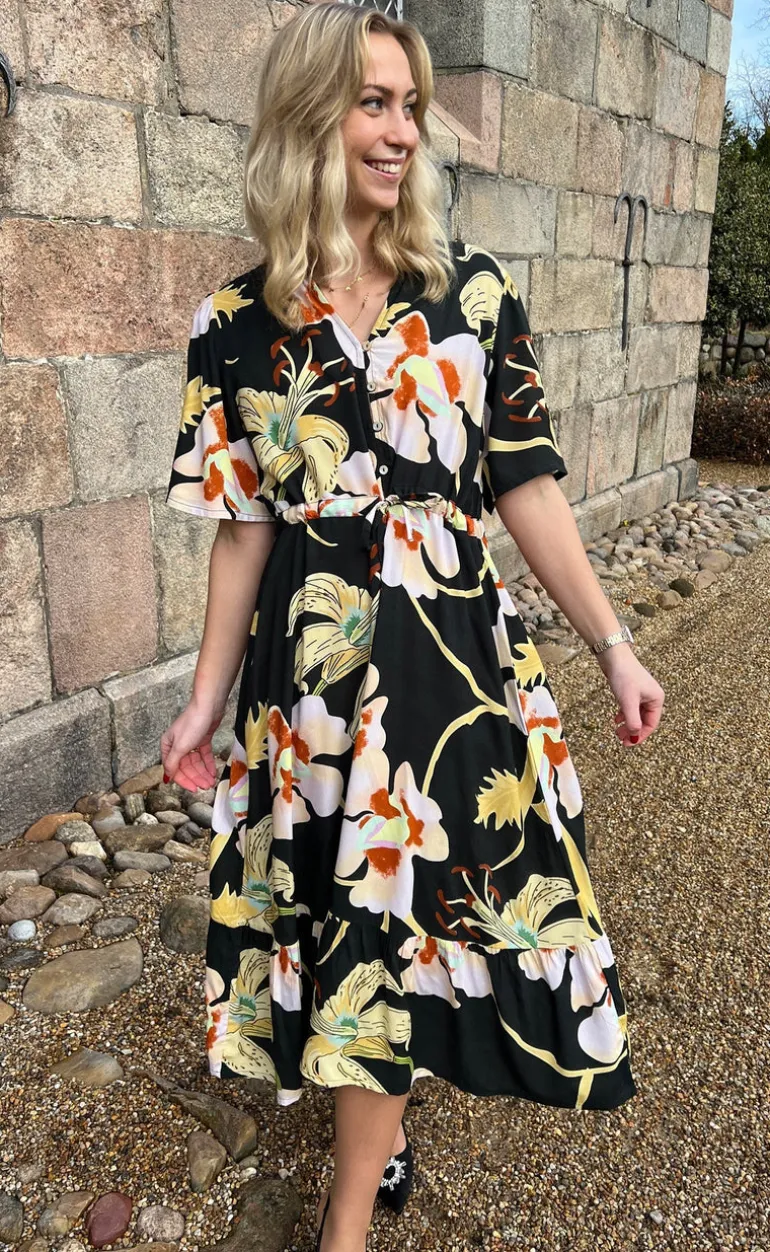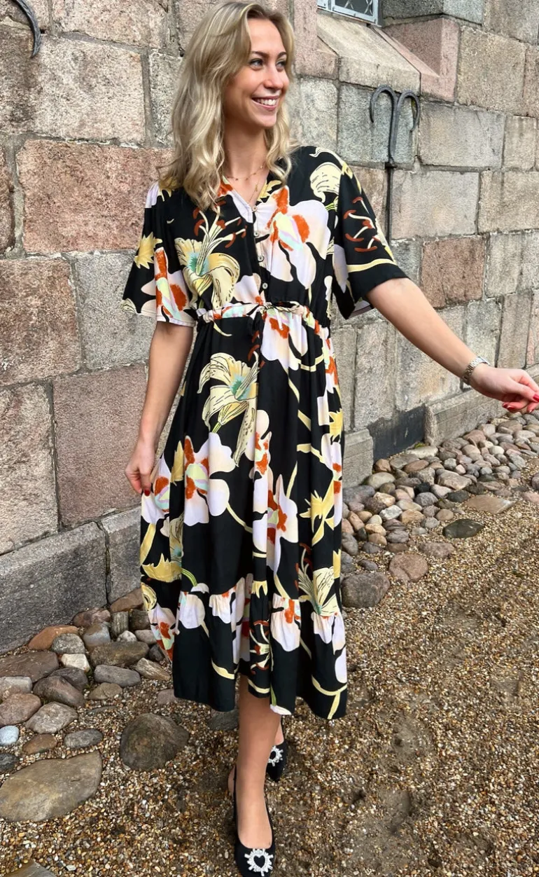 Flot kjole fra INA Copenhagen i sort med blomsterprint i flotte farver.