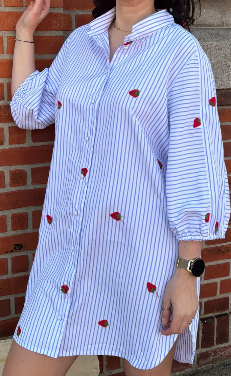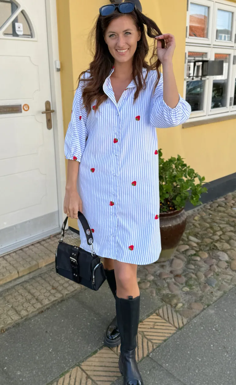 Den yndigste kjole fra INA Copenhagen i et blå og hvid stribet print, med små broderede jordbår.