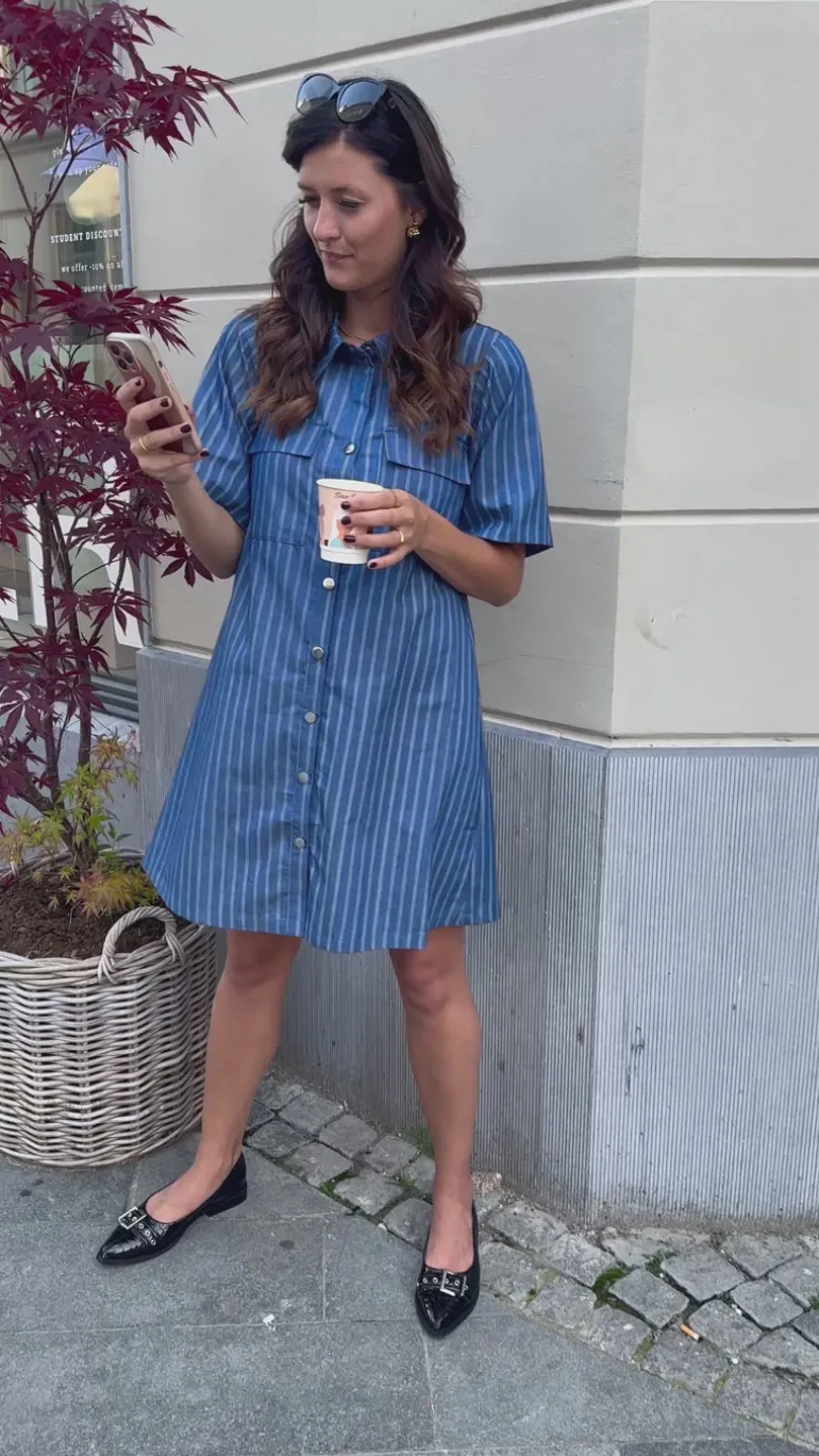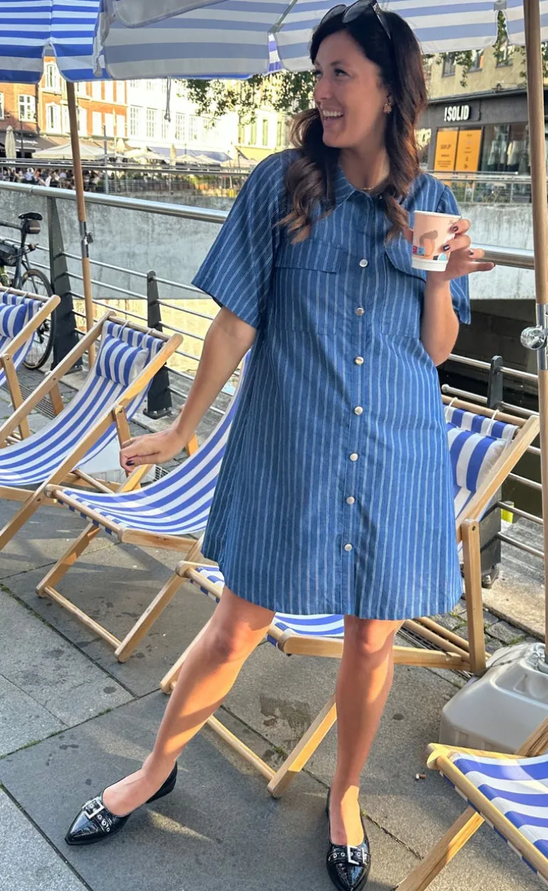 Flot kjole fra INA Copenhagen i denim blå med nålestriber.