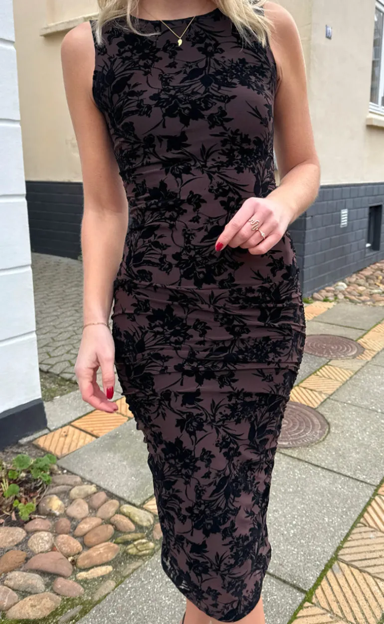 Den smukkeste mesh kjole fra INA Copenhagen i en brun farve med sorte blomster i velour.