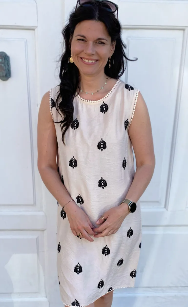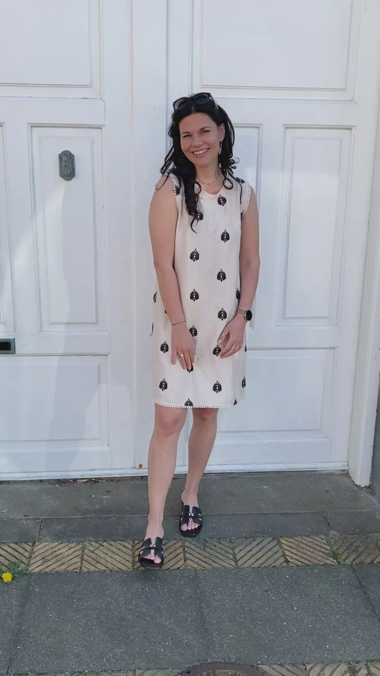 Moderne og simpel kjole fra INA Copenhagen i beige med sort broderi.