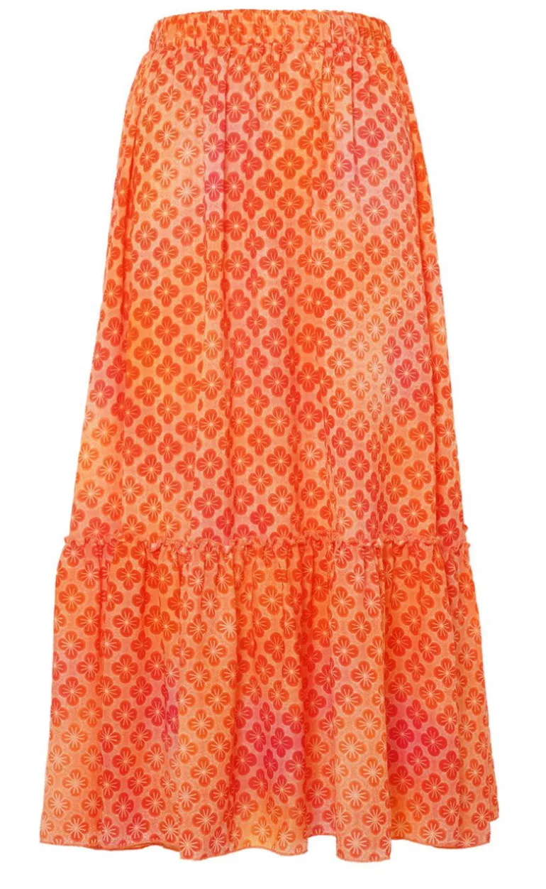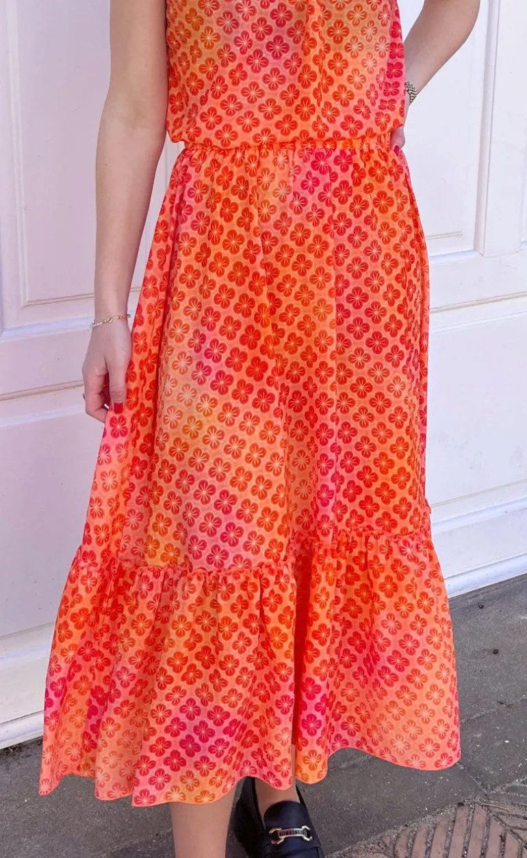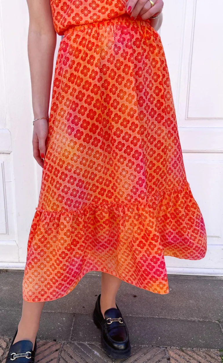 Elegant nederdel fra INA Copenhagen i et eksklusivt rødorange print.