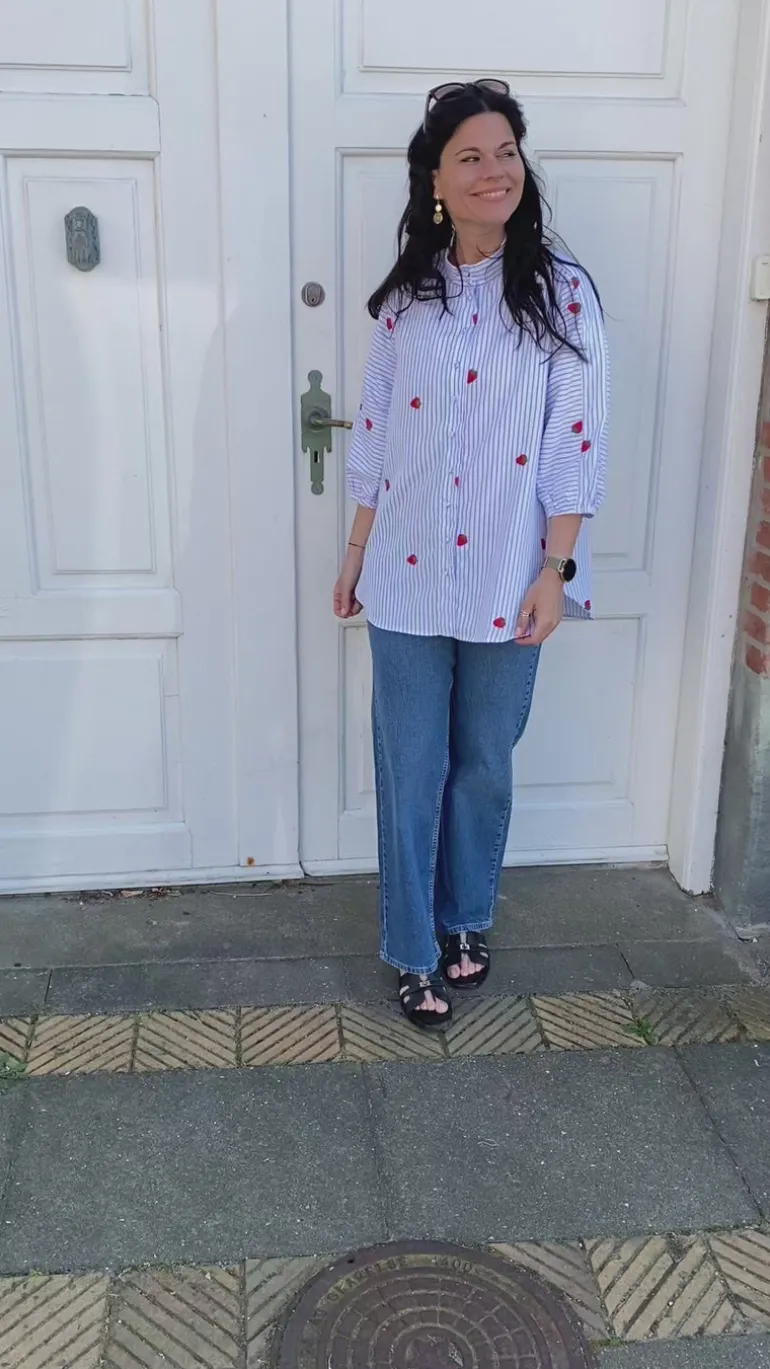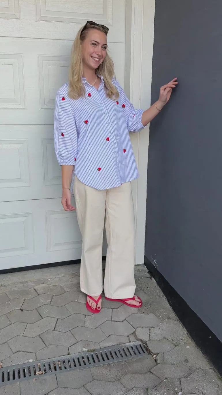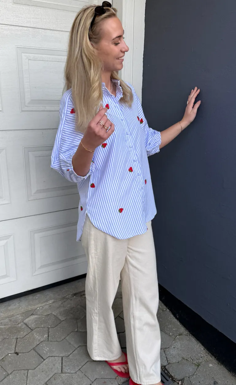 Den fineste skjorte fra INA Copenhagen i et blå og hvid stribet print med små broderede jordbår.