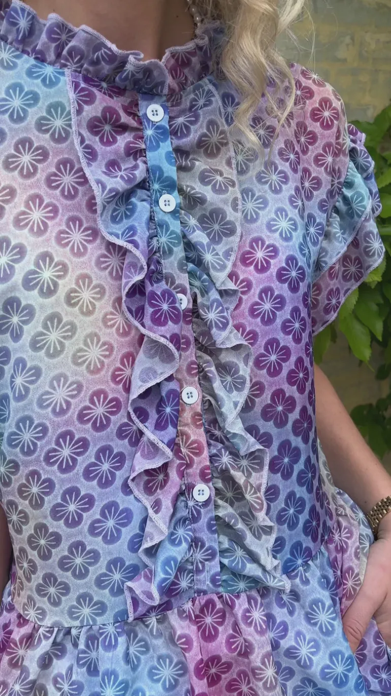 Toppen har flæse-ærmer og en åbning med perlemorsknapper fortil med flæser omkring.