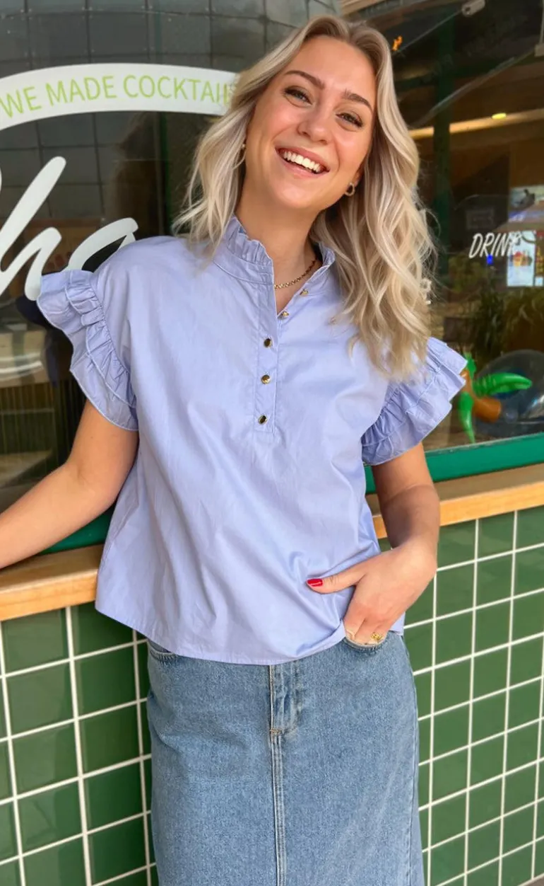Toppen har de fineste flæse-ærmer og en åbning fortil med guld knapper.