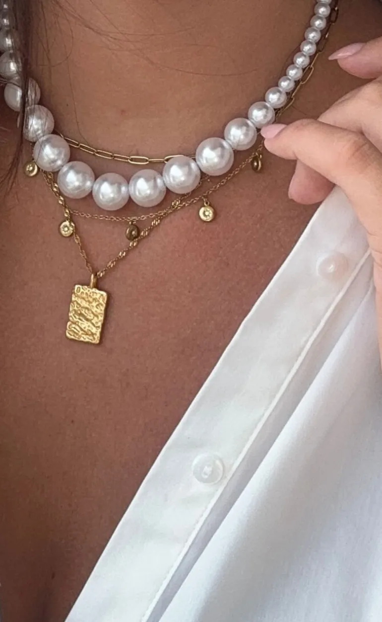 Flot halskæde fra Smykkeli Copenhagen i guld med et firkantet vedhæng, der har en hamret overflade. Den perfekte halskæde til både hverdag og særlige lejligheder!