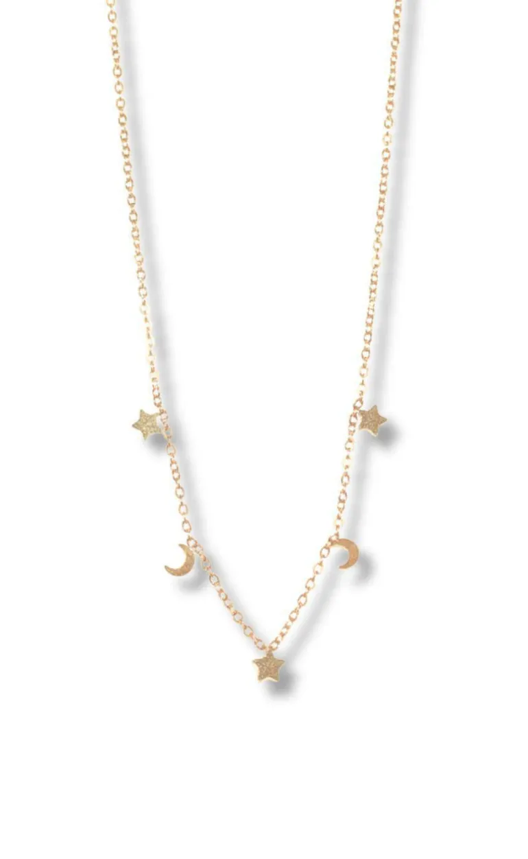 Fin halskæde fra Smykkeli Copenhagen i guld med stjerner og måner. Halskæden har et enkelt og stilrent look, der pifter ethvert outfit op.