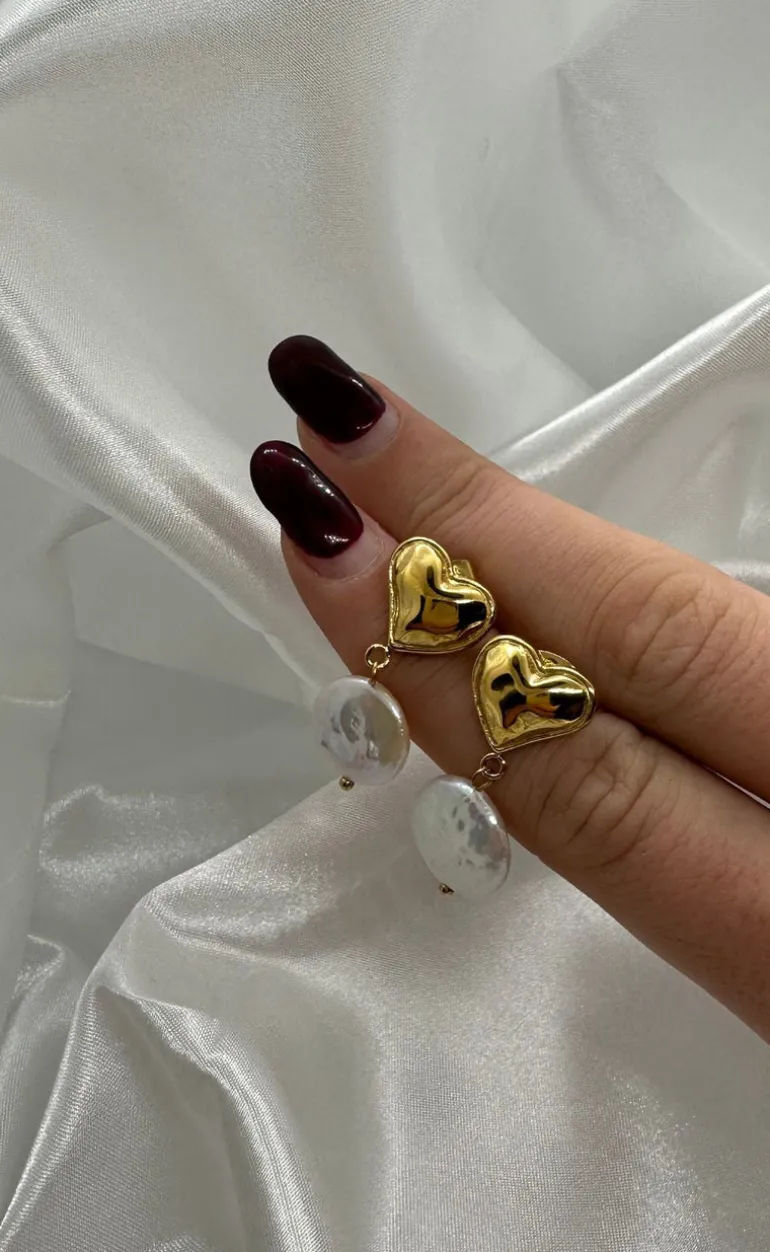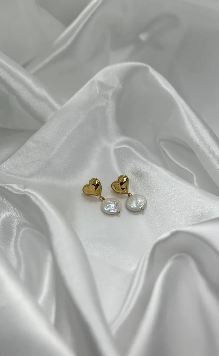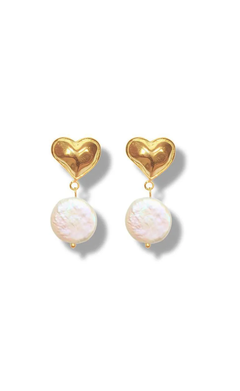 Eksklusive hænge øreringe fra Smykkeli Copenhagen med et 18k guldbelagt hjerte og en fin perle.