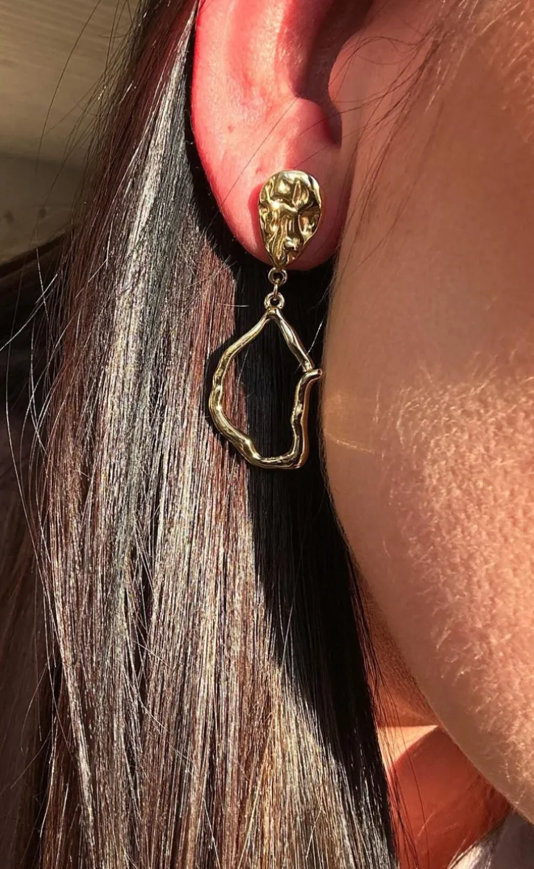 Smukke øreringe fra Smykkeli Copenhagen, der hænger ned fra øret. Øreringene er guld og har en hamret overflade, som skaber et eksklusivt udtryk.
