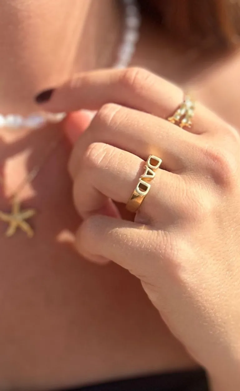Flot ring fra Smykkeli i guld, med skriften “DAD”.
