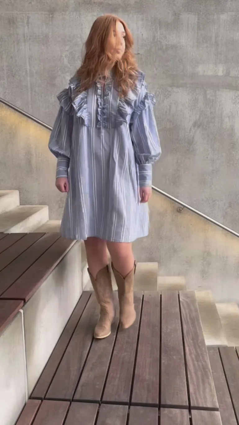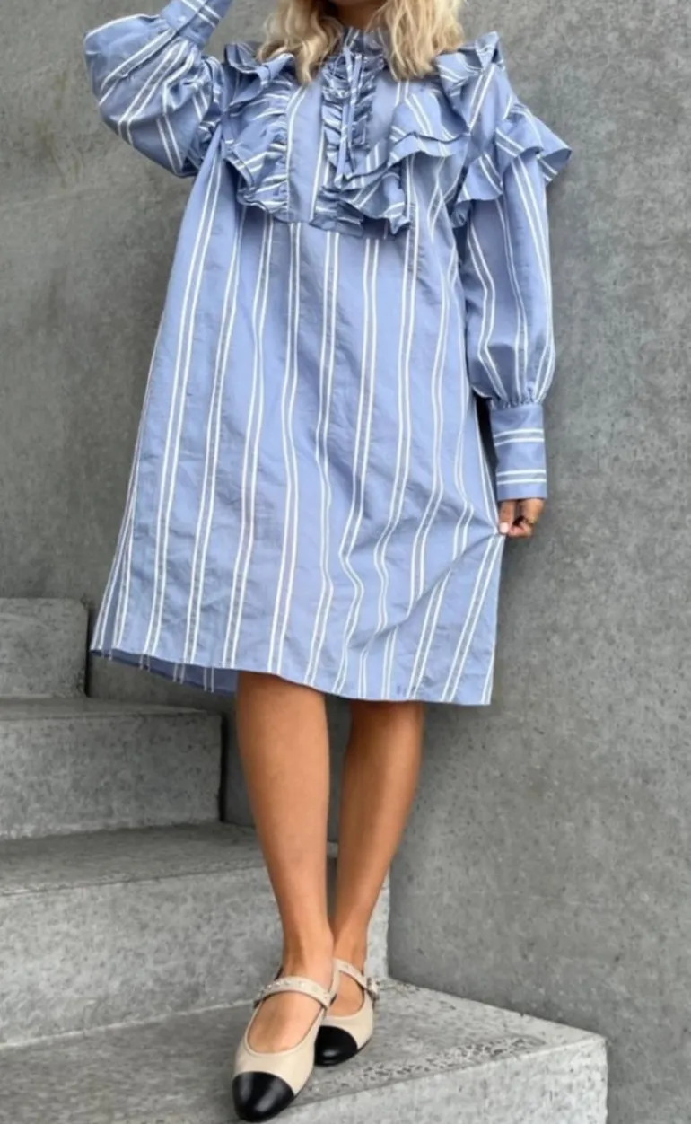 Fin kjole med striber i blå og hvid.