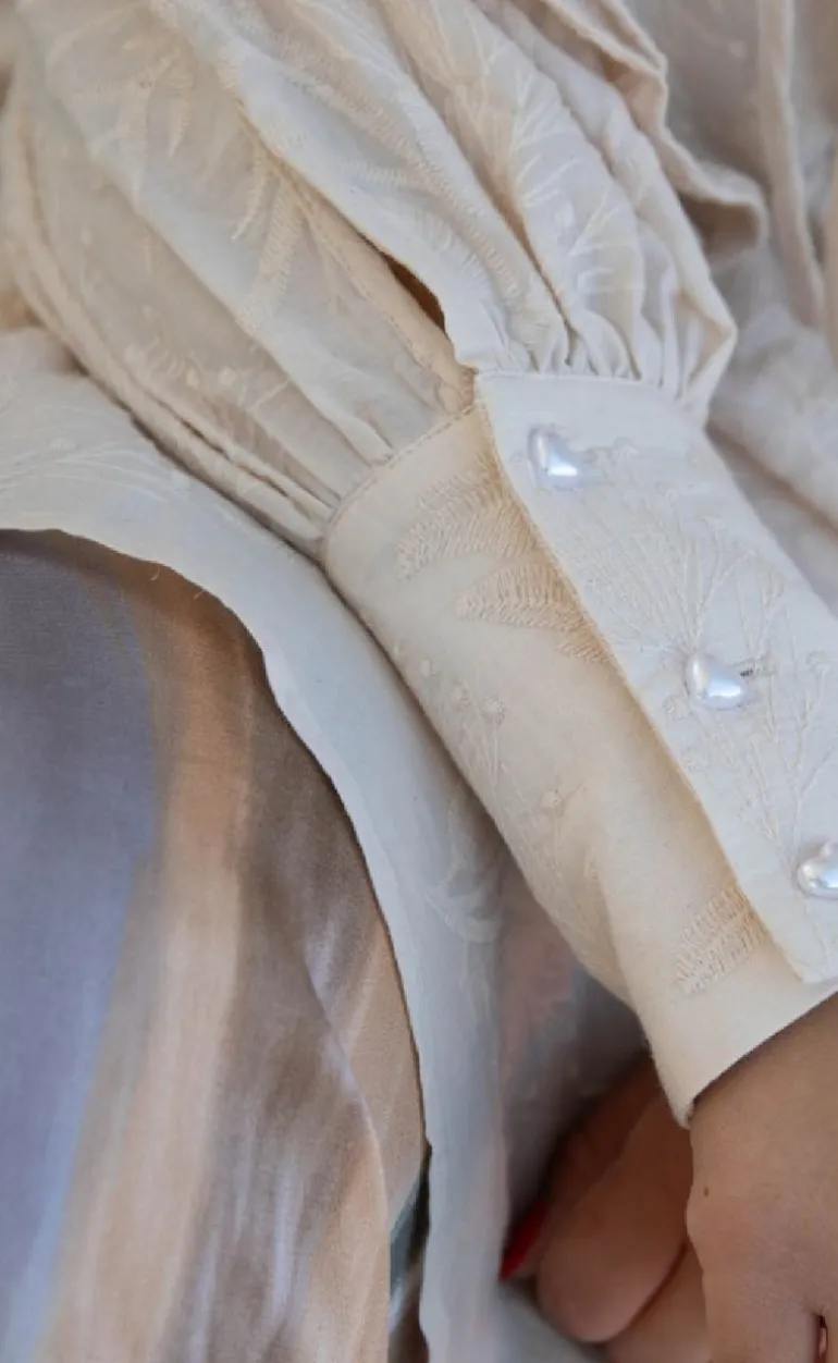 Den har flæser og diskrete broderi som tilføjer et drømmende udtryk, mens de perleformede hjerteknapper på manchetterne giver et ekstra feminint og unikt touch.