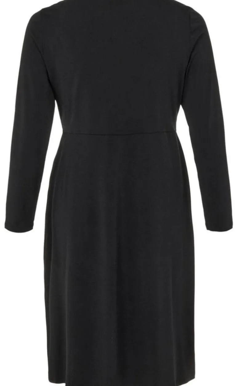 Flot mellemlang slå-om kjole fra Vila i Sort. Kjolen har en v-hals, korte ærmer og lavet i et lækkert strækbart materiale.