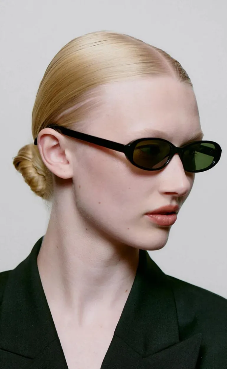Seje solbriller i sort med grønt glas.