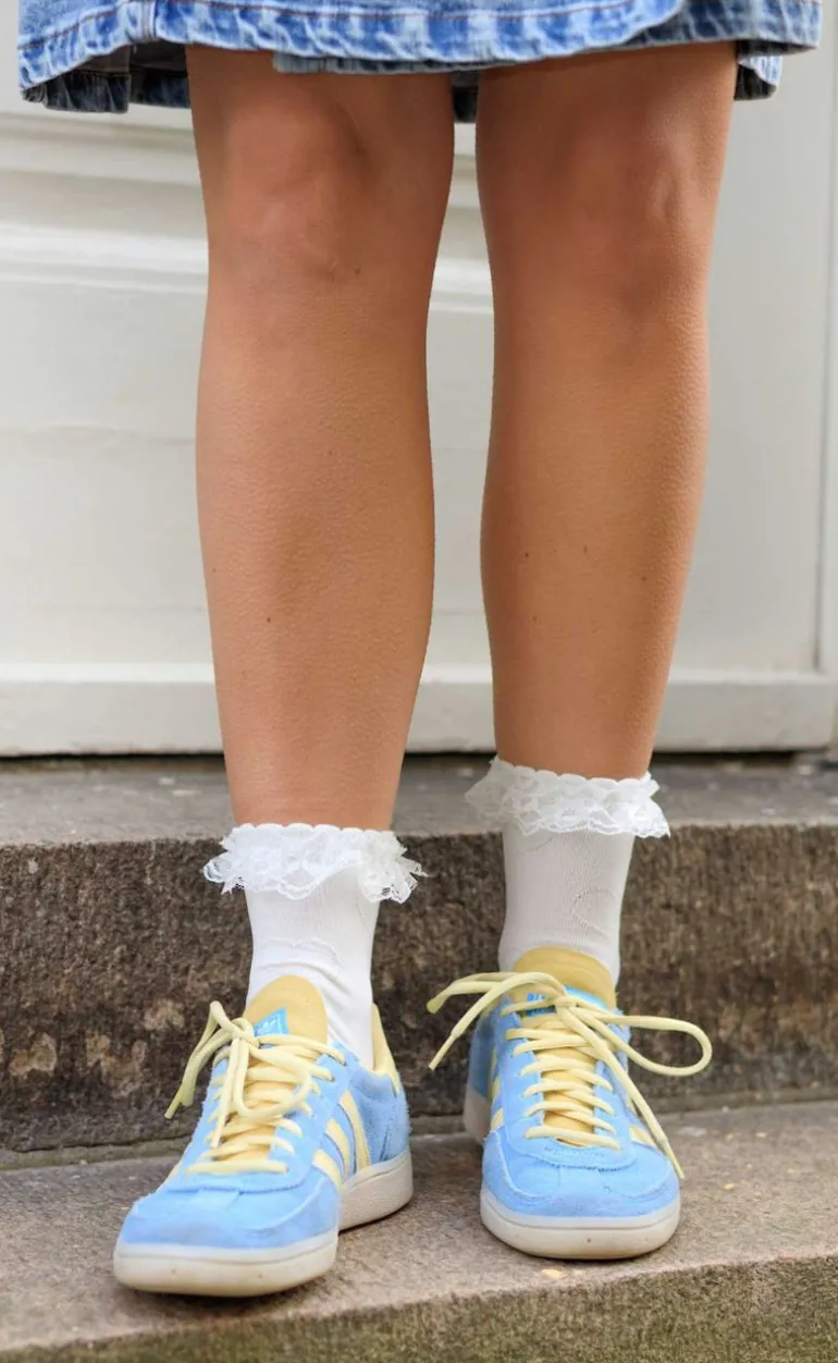 Fine hvide strømper med støre hvide hjerter og flæseblonder.