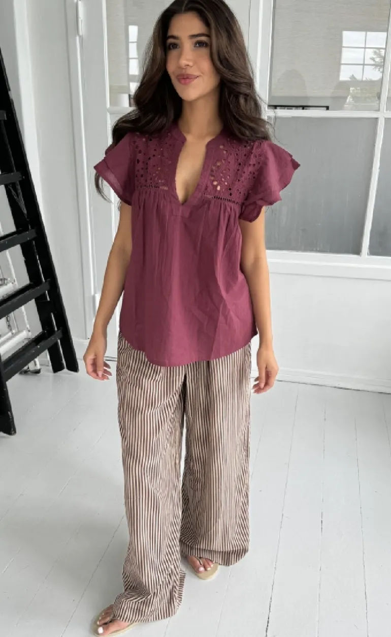 Toppen har broderi anglaise detaljer ved brystet samt korte ærmer med flæsekant.