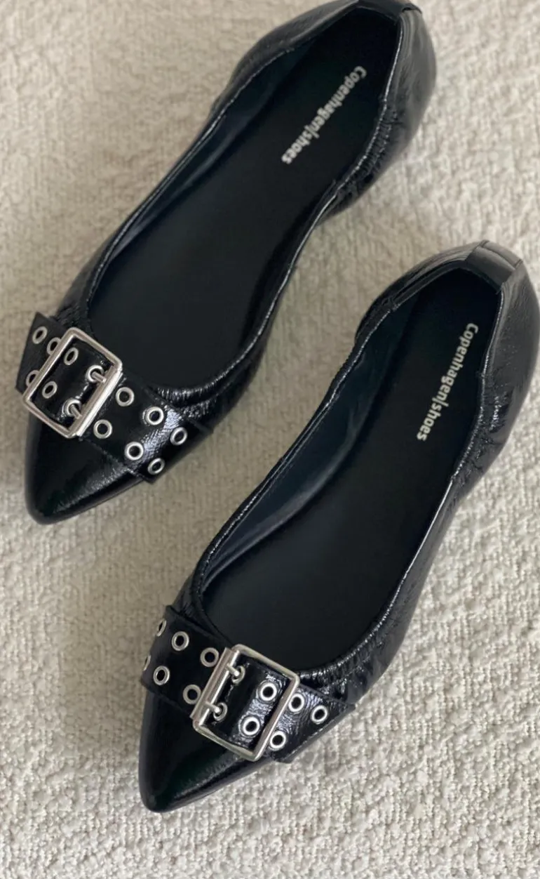 Disse ballerinaer kommer i en lækker skind kvalitet med én stor spænde og en spids snude.