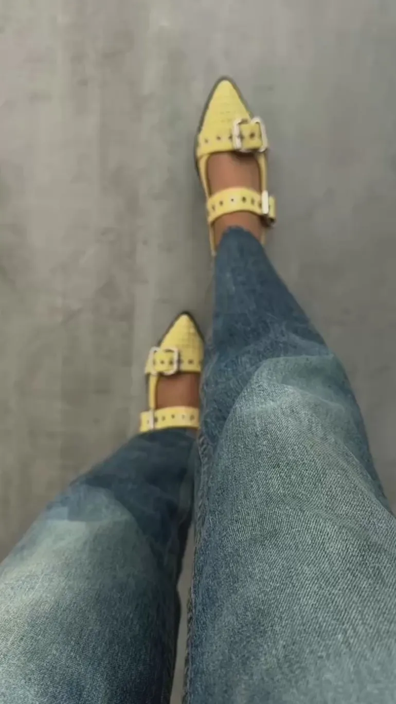 De fineste ballerinaer fra Copenhagen Shoes i gul med to spænder samt sten.