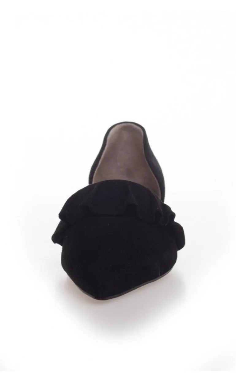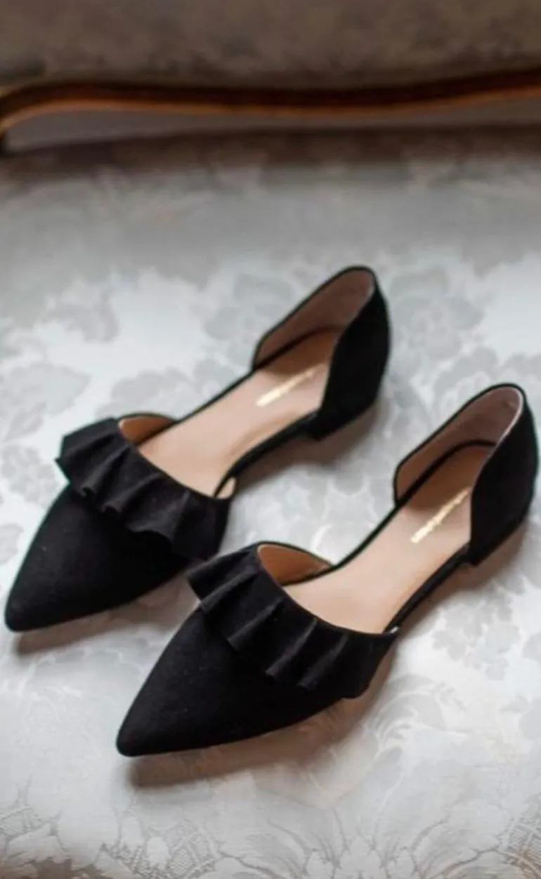 Skoene har en spids snudesløje og fine flæsedetaljer.