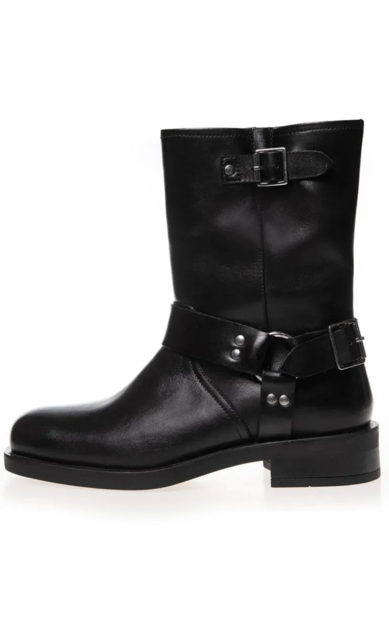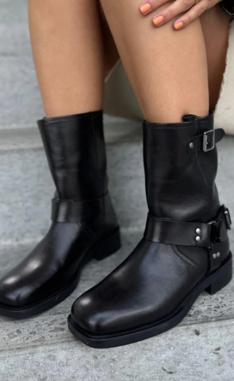 Støvlen har en firkantet snude og en justerbar spænde, som sørger for optimal pasform.