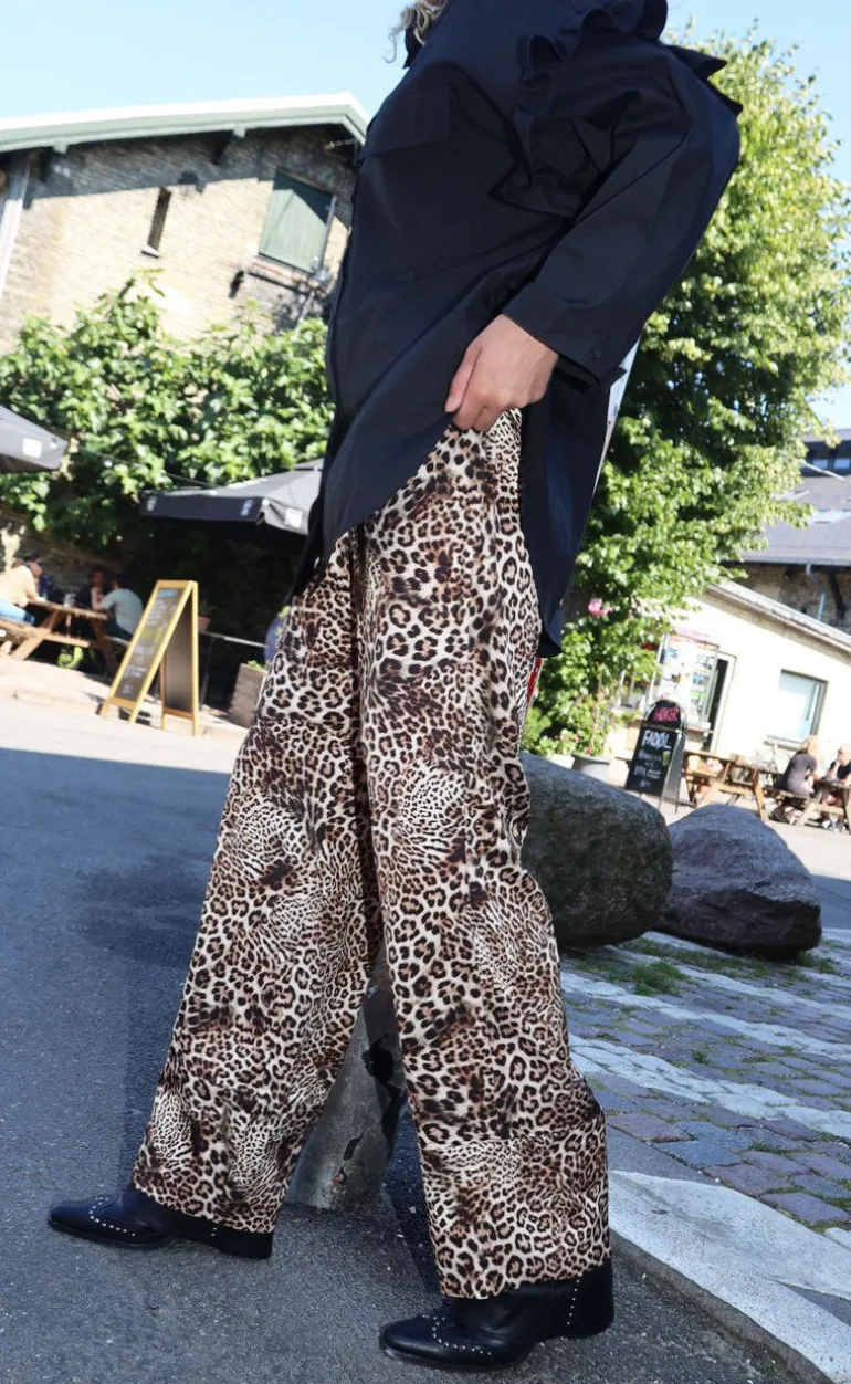 Bløde og stilfulde bukser i dyreprint. Bukserne har en elastisk talje med snore og er perfekte til afslapning derhjemme eller til at skabe et chic look med en skjorte og hæle til en aften ude.