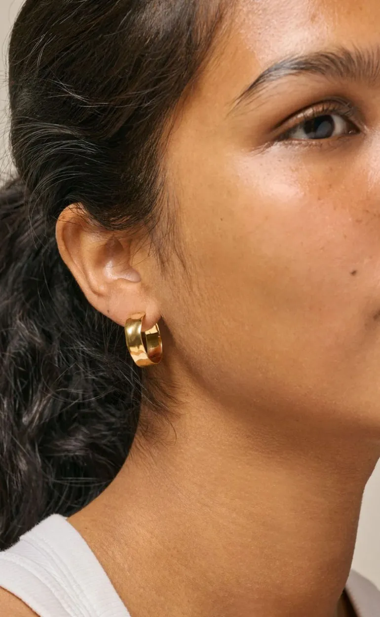 Smukke øreringe, med deres unikke bølgende overflade tilføjer de elegance til dit look. De kan nemt stackes med andre hoops, men kombineres perfekt med Sandra narrow hoops for et eksklusivt og feminint udtryk. Trods deres iøjnefaldende design er de lette i vægt.
