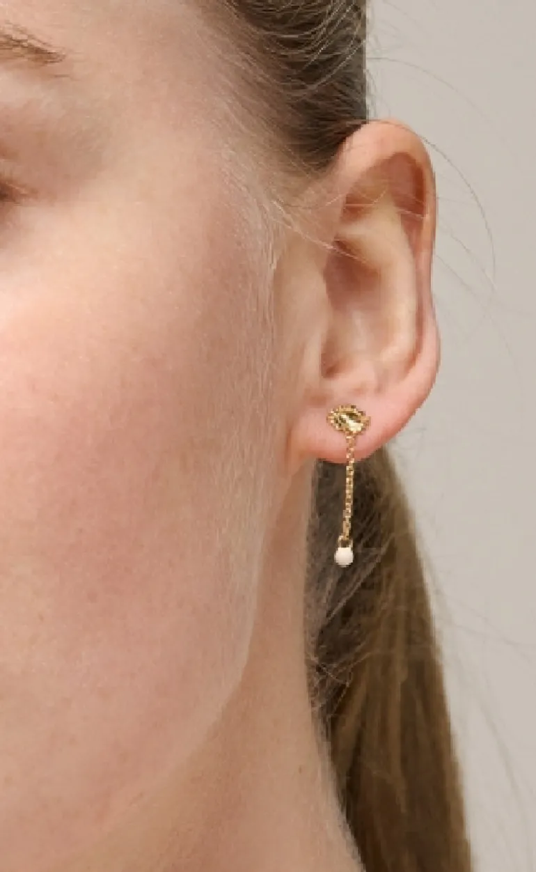 Smukke guldbelagte øreringe fra ENAMEL Copenhagen med en lille perle, samt en unik sol detalje.