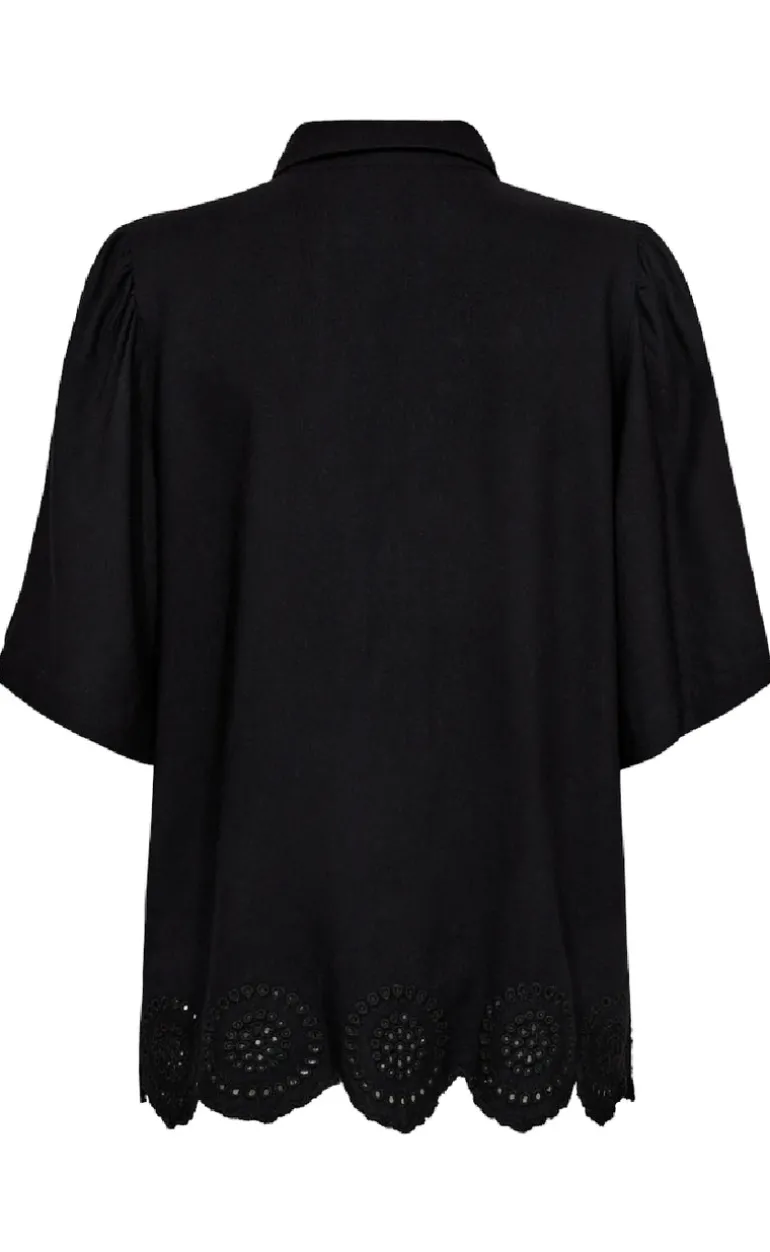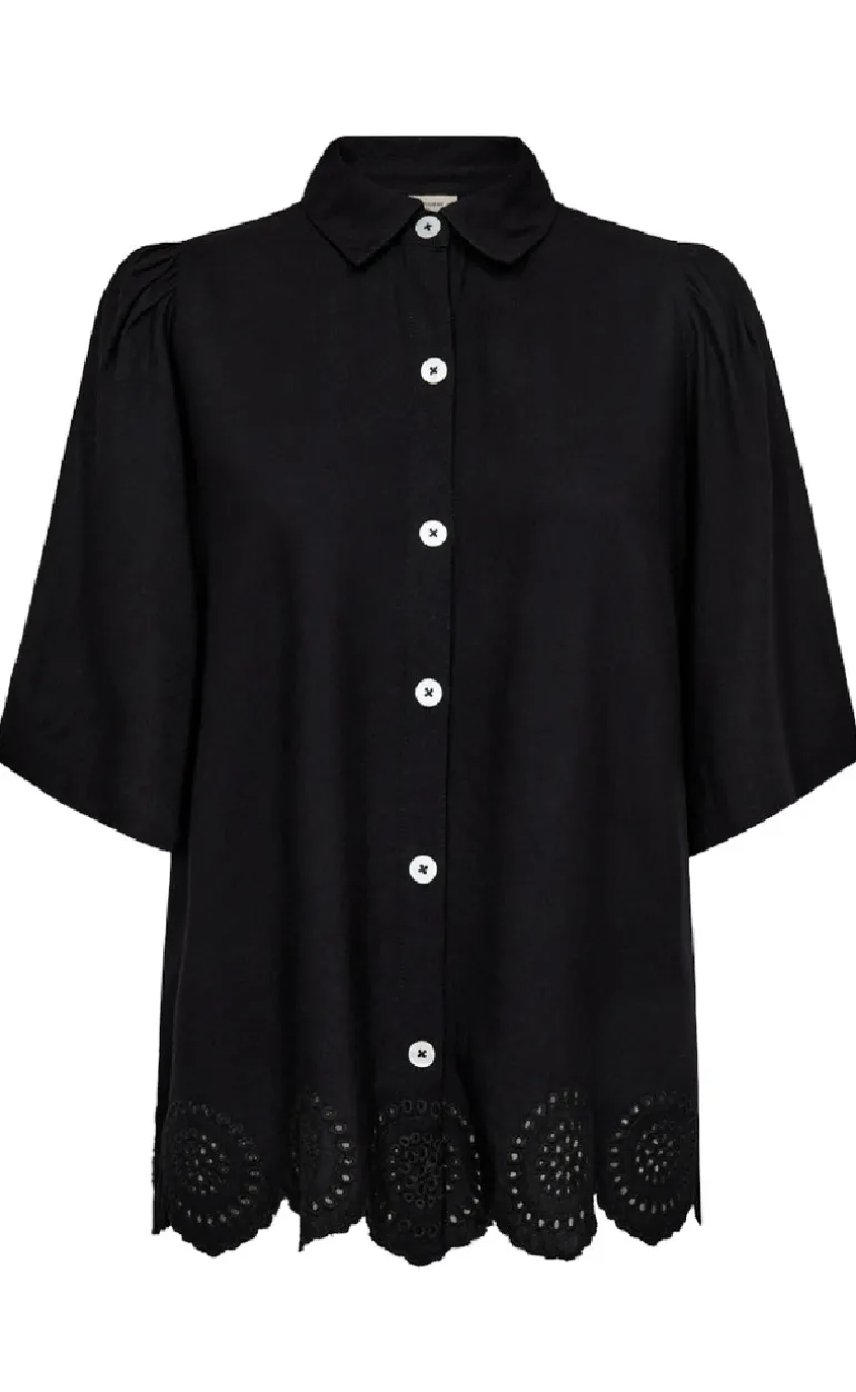 Sort bluse fra Freequent, i et flot print som har nogle fine broderi anglaise detaljer forneden.