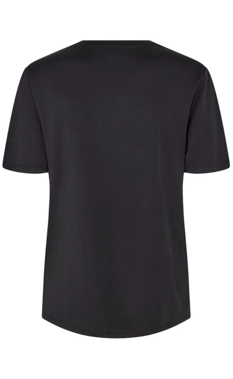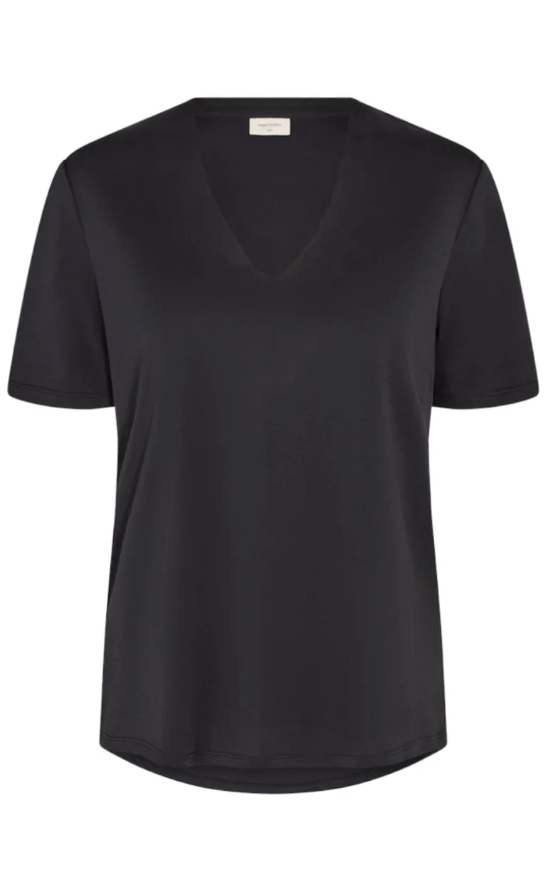 Blusen er kortærmet, har en afslappet pasform og en dyb v-udskæring.