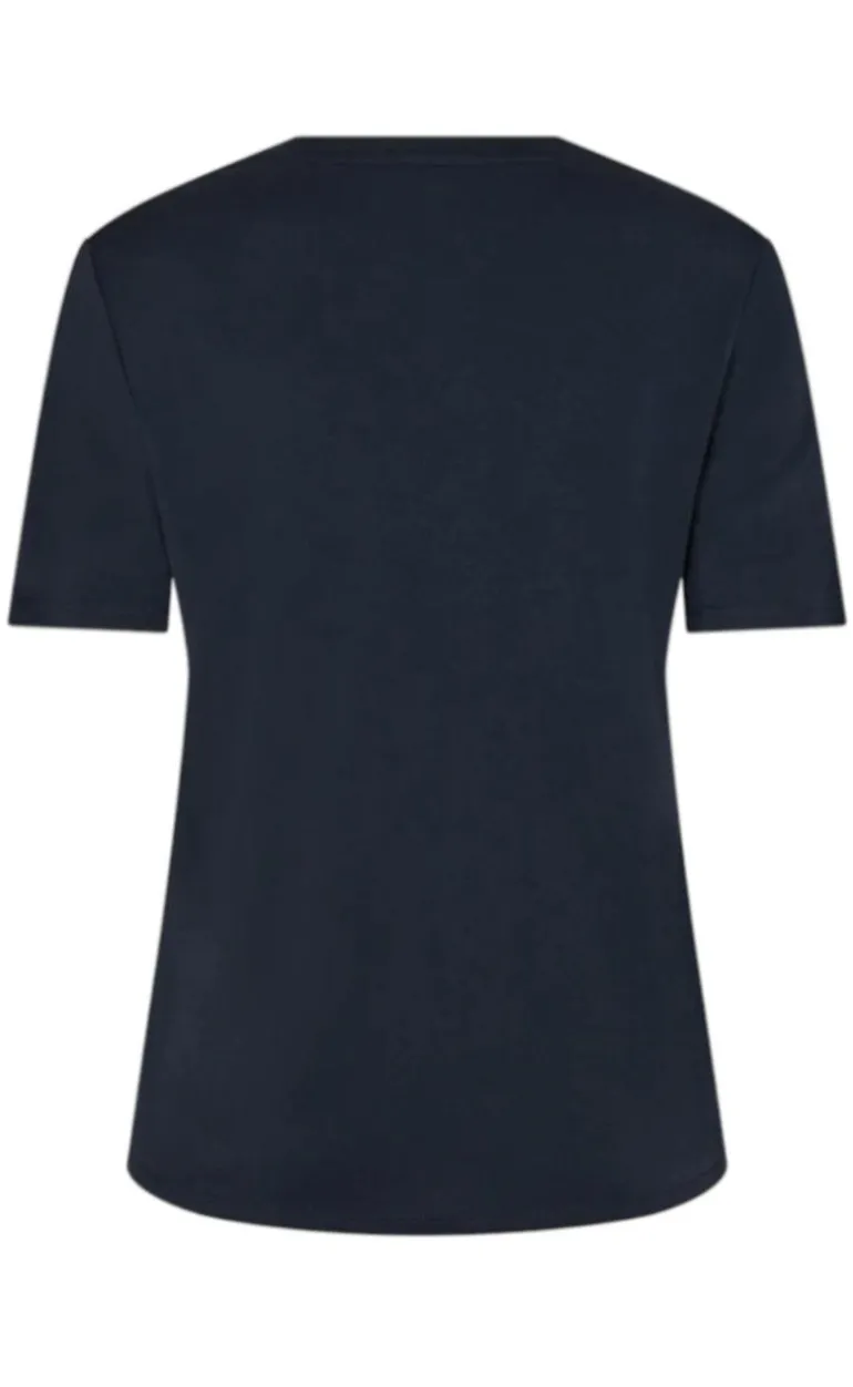 Blusen er kortærmet, har en afslappet pasform og en dyb v-udskæring.
