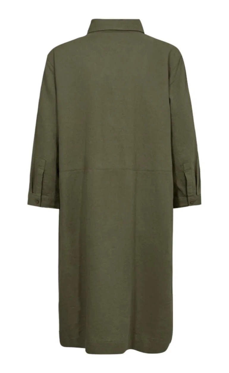 Kjolen har en afslappet pasform med en knaplukning foroven samt én brystlomme.
