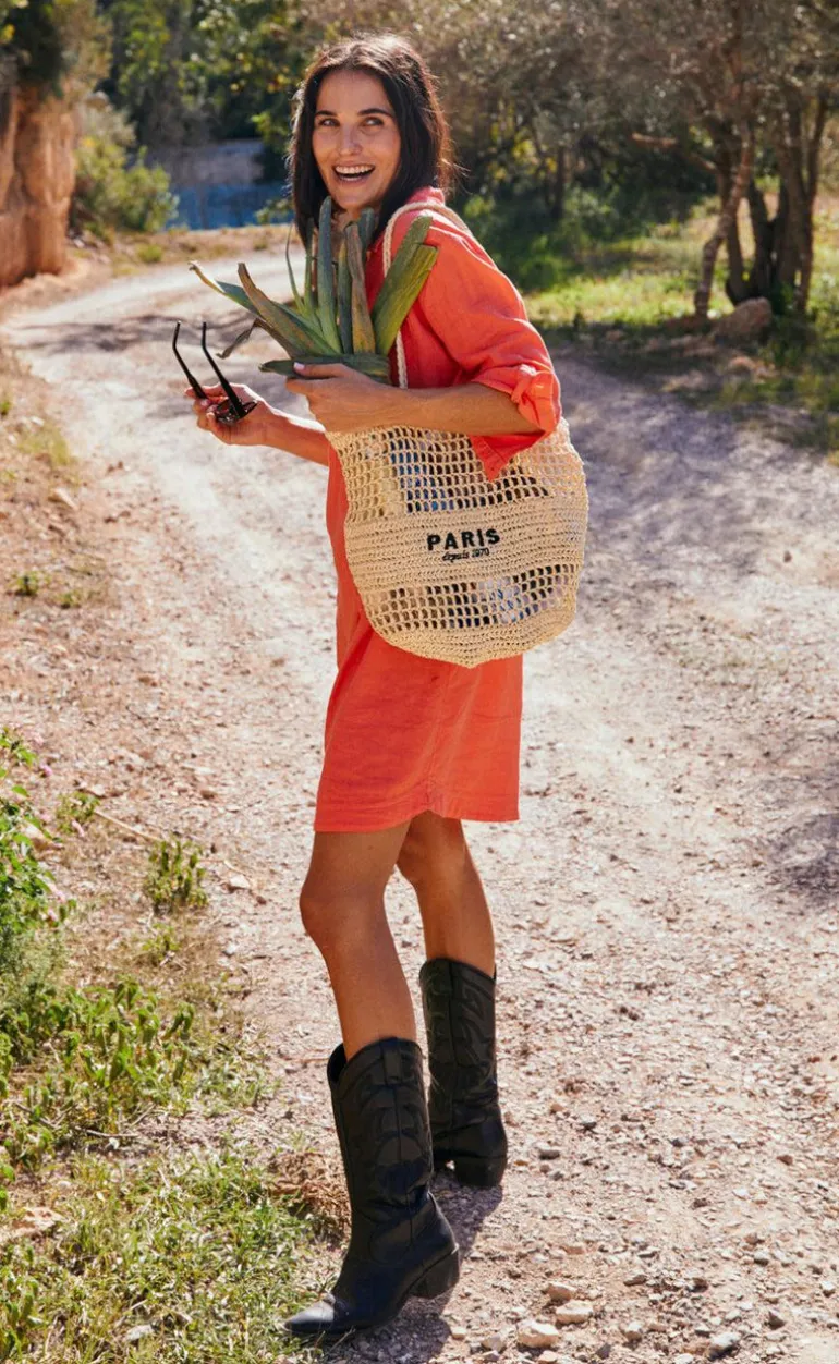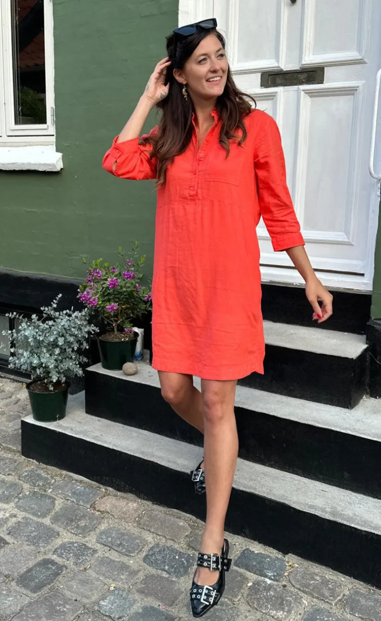 Den sødeste hør kjole fra Freequent i en coral farve.