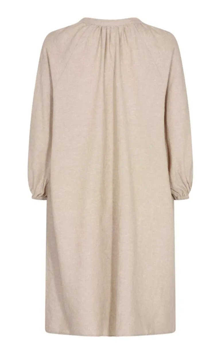 Kjolen har lange ærmer ærmer, en v-udskæring efterfulgt af en kort knaplukning. Desuden har den en løs pasform.