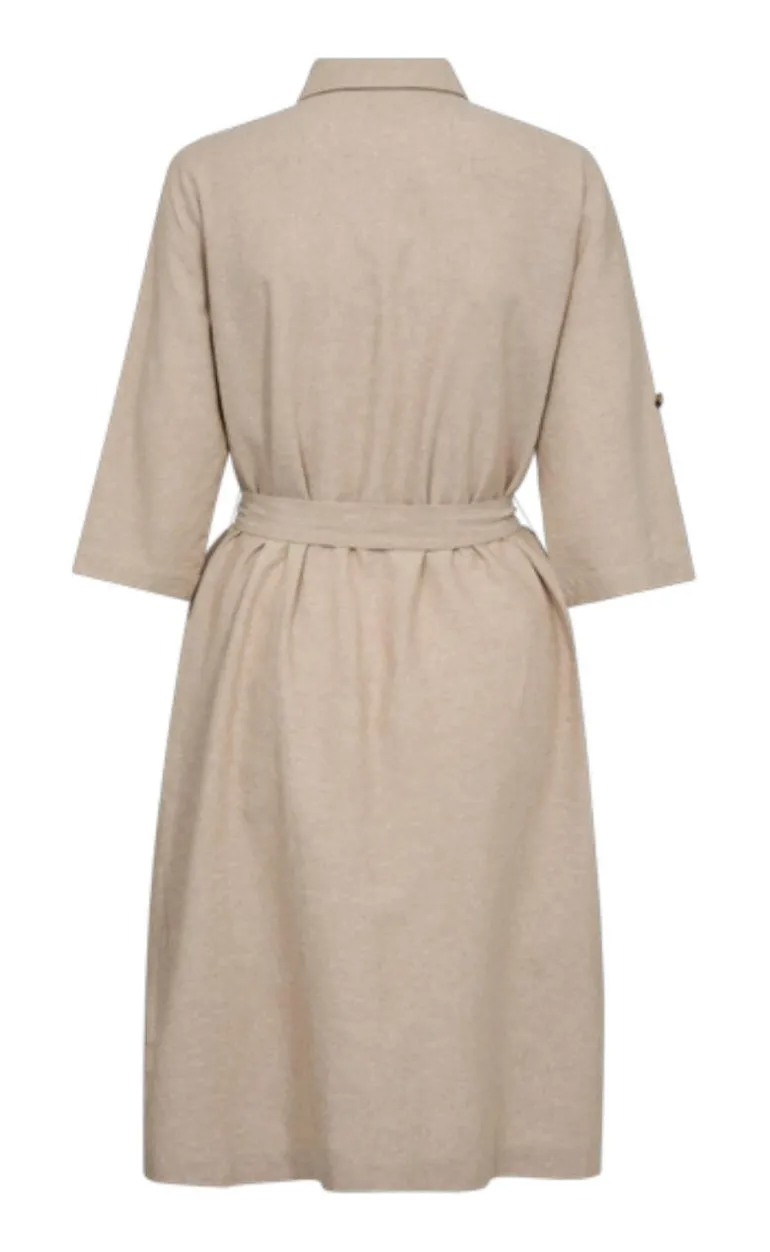 Kjolen har 3/4 lange ærmer, er gennemknappet samt har den et bindebånd i taljen.