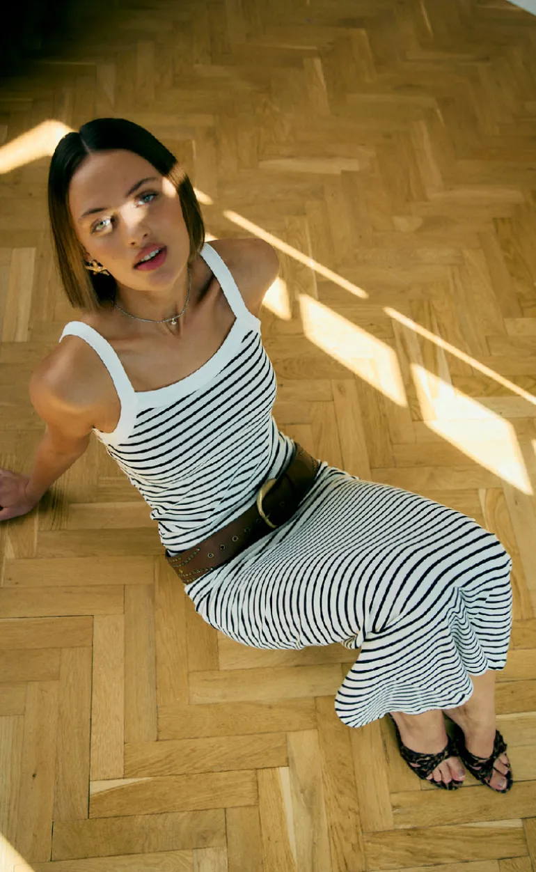 Tætsiddende maxi nederdel fra Freequent i et sort og hvid stribet print