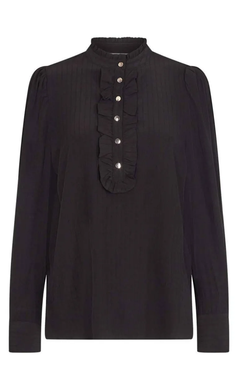 Fin Freequent skjorte i sort med diskrete nålestriber og flæsedetaljer.