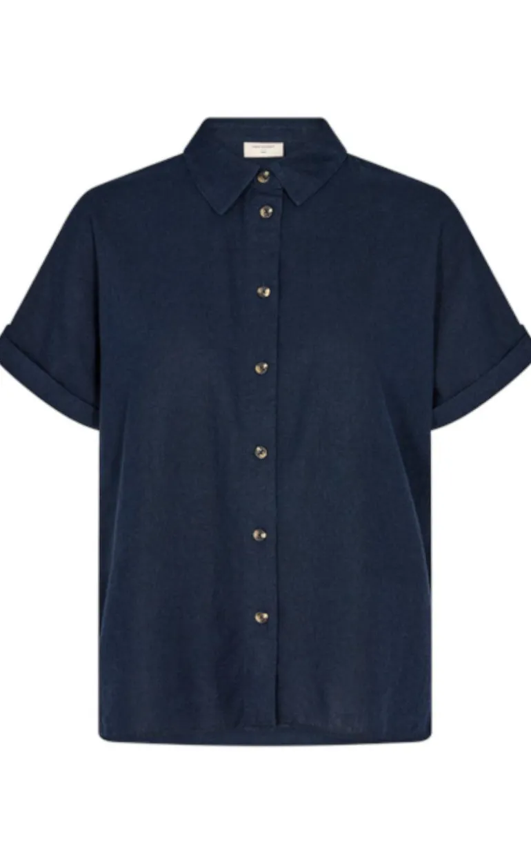 Skjorten har korte ærmer med opsmøgning, er gennemknappet, en klassisk skjortekrave samt en diskret overskæring på ryggen.