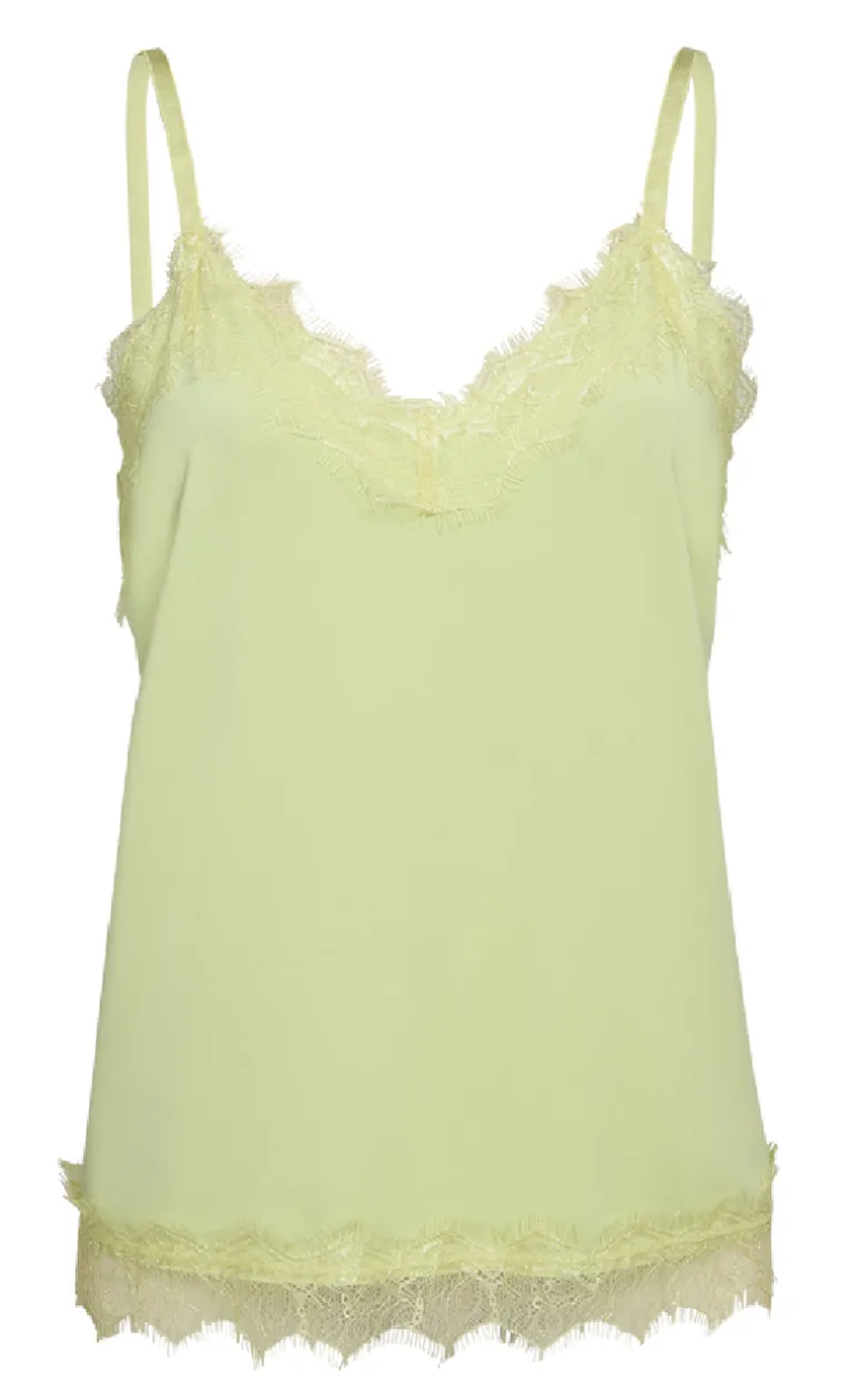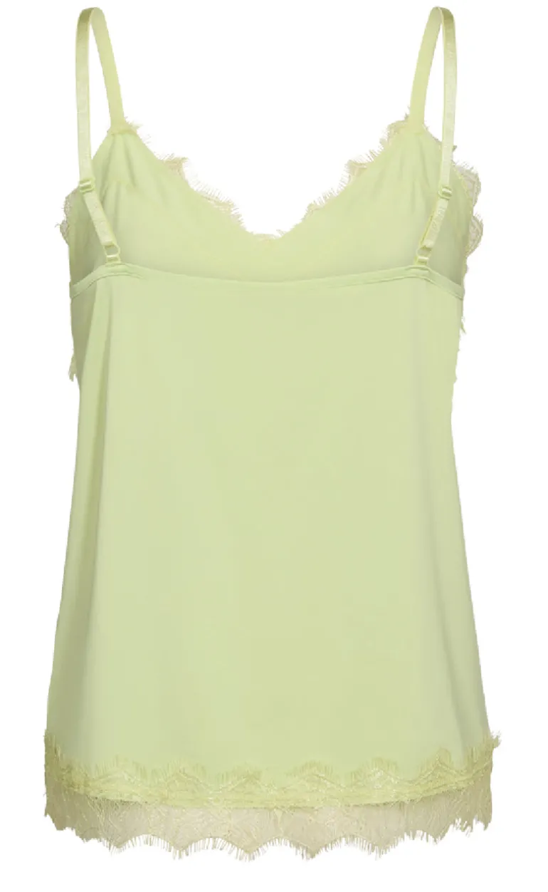 Toppen har v-hals og justerbare stropper, så den kan tilpasses efter behov. Der er blonder ved halsen og i bunden af toppen.