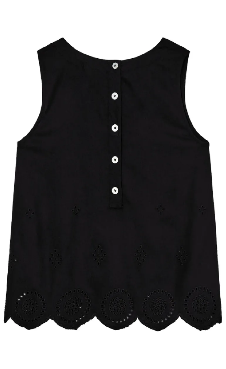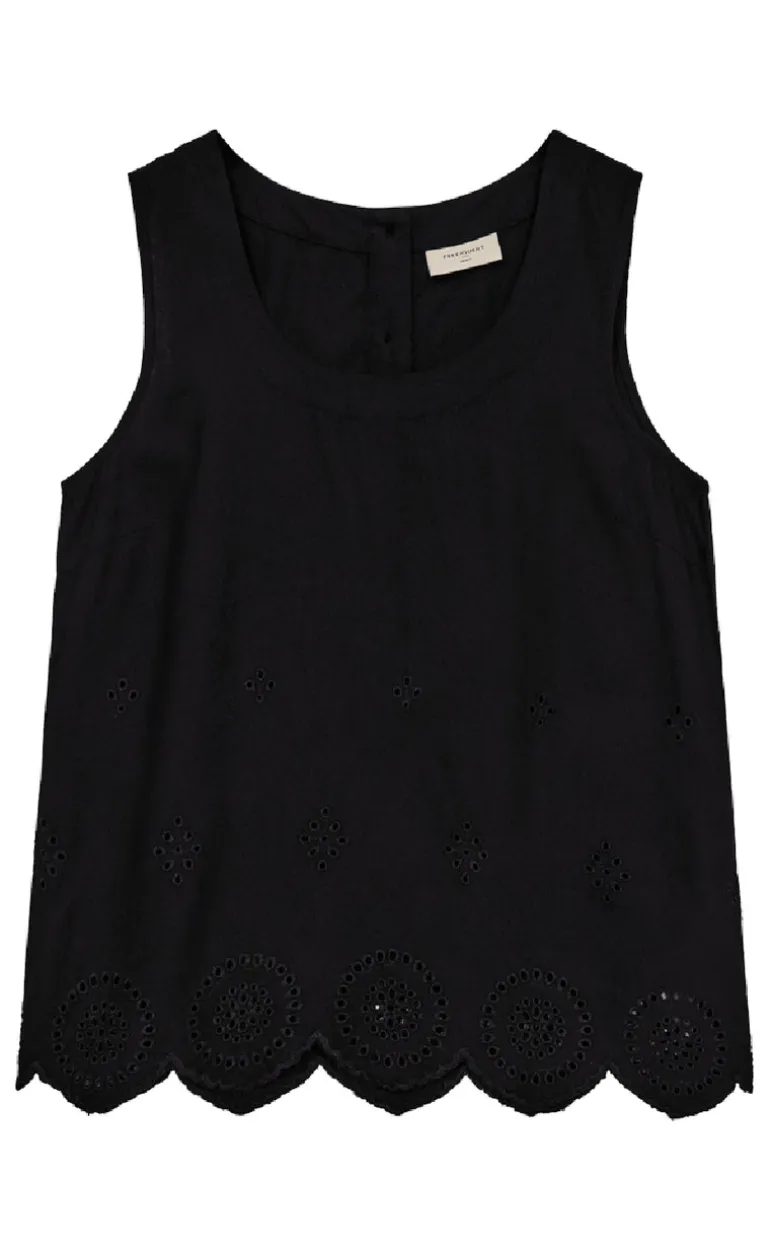 Sød top fra Freequent i sort, med en broderi anglaise detalje forneden.
