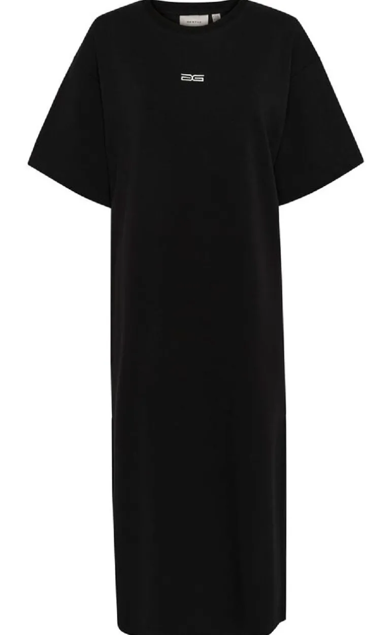Afslappet kjole fra Gestuz i sort med hvid print fortil.