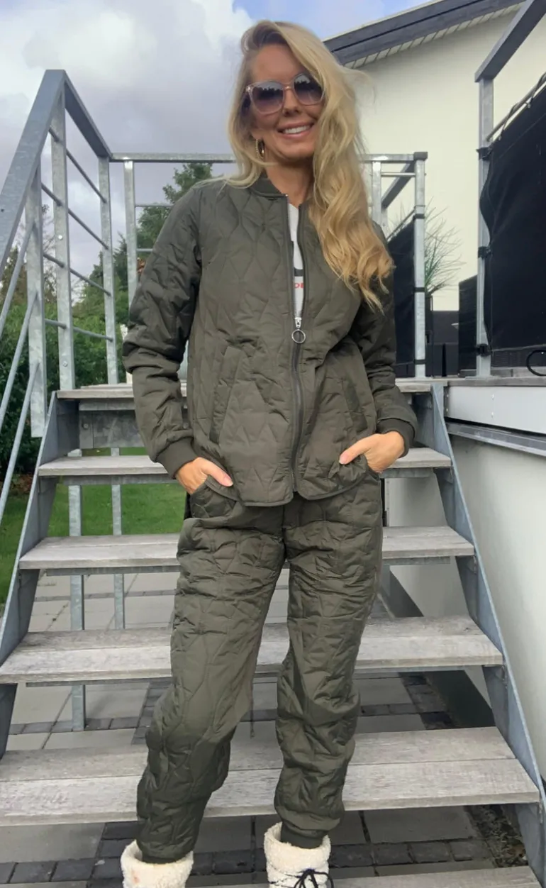 Bukserne er lavet i et lækkert quiltet materiale, har knappelukning, sidelommer og elastik forneden.