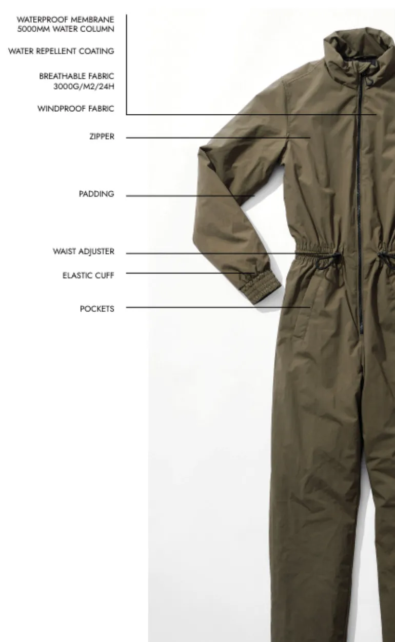 Flyverdragten åbnes- og lukkes med lynlås og har lange ærmer med vindstop. Den har elastik i taljen med justerbare stropper.