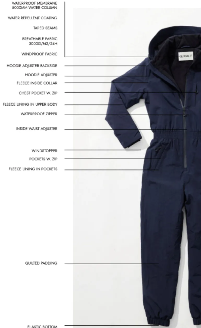 Flyverdragten har en varm fleeceforing og tapede syninger (som holder vand ude). Den er vindtæt, åndbar og har et vandsøjletryk på hele 5.000 mm. Dragten åbnes- og lukkes med lynlås, har hætte og lange ærmer med vindstop. Den har elastik i taljen og brystlommer- samt sidelommer med lynlås.
