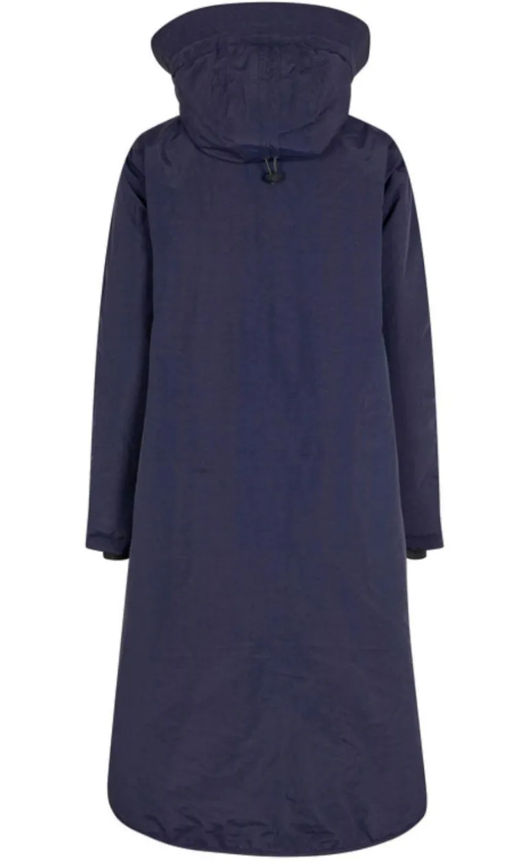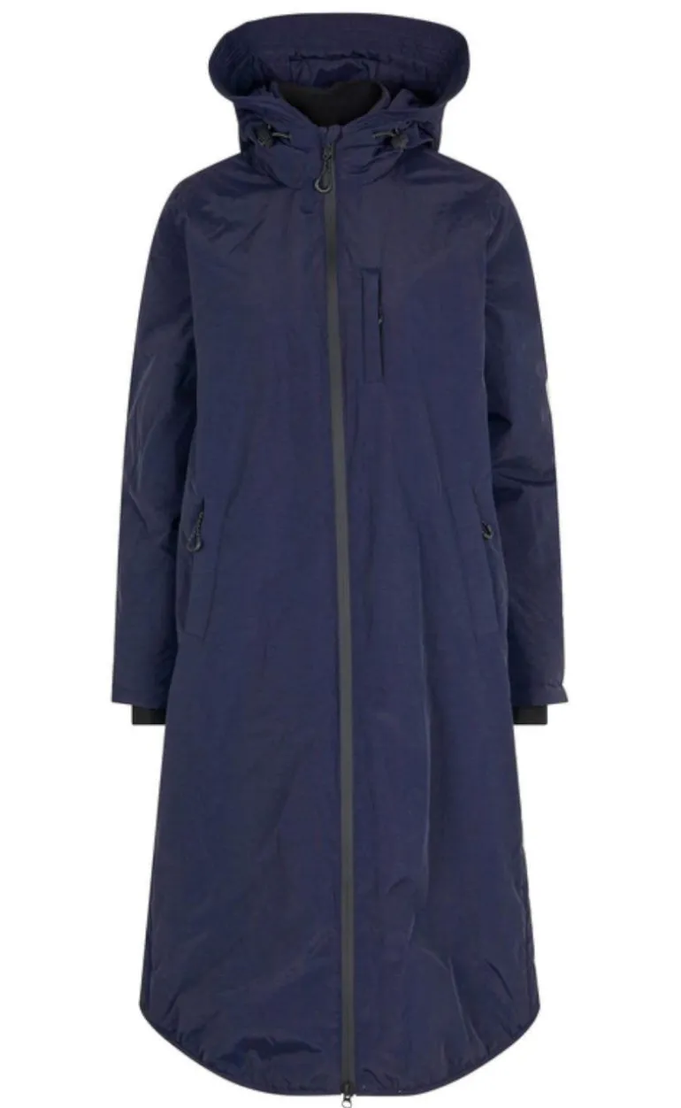 Jakken går til omkring knæene, har en gennemgående lynlås og rumlige lommer.