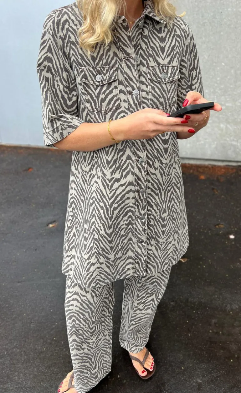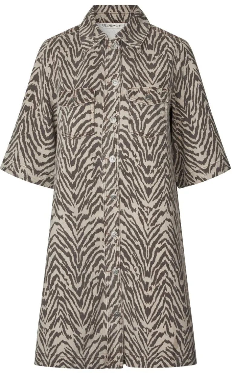 Kjolen har gennemgående knapper, korte ærmer og brystlommer.