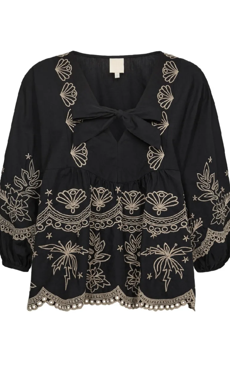 Sød bluse fra Gossia i sort med brune broderi anglasie detaljer.