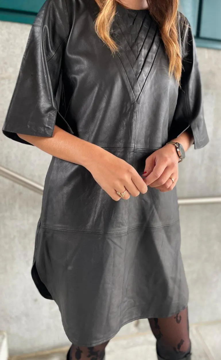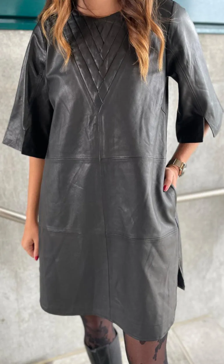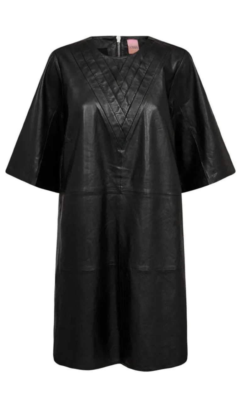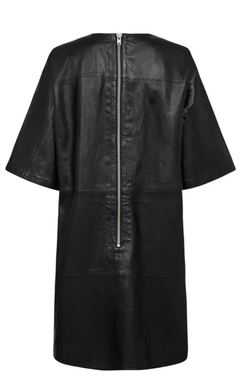 Kjolen har korte ærmer og rund halsudskæring. Den har smarte detaljer fortil og lukkes med en lynlås bagpå.